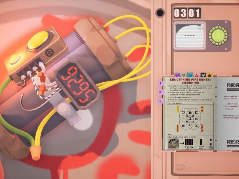 Vous pouvez réparer toutes ces pièces en suivant votre manuel étape par étape. Lorsque vous prenez le manuel, vous pouvez accéder aux chapitres appropriés, mémoriser les parties et suivre chaque étape. Ce manuel est tout sauf facile à comprendre, ce qui rend le jeu si difficile. Vous devez découvrir par vous-même comment fonctionne un appareil et vous faciliter la tâche grâce à l'expérience. En fait, Oncle Chop ne vous permet pas de faire des erreurs, mais vous devez vraiment en tirer des leçons. Comprendre ce manuel étrange et toutes les parties est ce qui rend le jeu si amusant. Il n’y a rien de mieux que de voir un reçu approuvé après avoir bricolé avec succès un nouveau type de pièce. Cependant, j’imagine que comprendre ces étranges appareils n’est pas donné à tout le monde. En combinaison avec la pression du temps, cela peut provoquer pas mal de frustration, c'est pourquoi le jeu a un niveau d'entrée assez élevé. Mais si vous acceptez que vous mourrez parce que vous n’avez pas bien suivi ou compris le manuel, vous ferez probablement un peu plus de progrès la prochaine fois. Heureusement, le jeu contient également un mode simple dans lequel vous ne ressentez aucune pression de temps. Uncle Chop's Rocket Shop ne s'en cache pas : il utilise une bonne dose d'humour cru et de violence de manière comique. Les différentes manières sèches de mourir font régulièrement rire. Cela rend les nombreux décès beaucoup moins graves. La plupart des personnages que vous rencontrez sont très étranges, ce qui rend le tout encore plus drôle. Il existe également un risque qu'ils vous tuent subitement, ce qui garantit que vous resterez toujours sur vos gardes. Le style artistique rappelle un peu un mélange de The Regular Show et de South Park et fait rire à chaque fois.