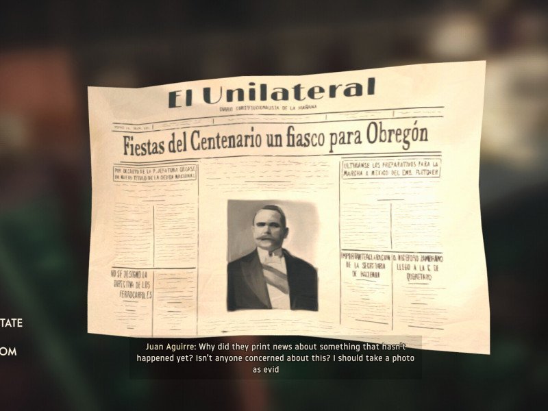 Après la révolution mexicaine, tout était en désordre. Ils se battaient tous pour le siège présidentiel et, lorsque la poussière s'est finalement calmée, chacun a conspiré pour éliminer l'autre. Un journaliste, récemment promu dans le journal El Unilatéral, découvre le fil d'une conspiration qui le conduira à enquêter sur qui a l'intention de donner une mauvaise image du président de l'époque, Álvaro Obregón. Ici, il faut partir de plusieurs points. Pour commencer, si vous connaissez l'histoire , "Mexico, 1921: A Deep Slumber" n'aura pas de rebondissements trop choquants. Pour continuer, l’intrigue est expliquée de manière assez simple, elle ne sera donc ni trop complexe ni très alambiquée. De plus, les personnages qui le composent mettent un peu de temps à surexpliquer certains faits compliqués. Cependant l’attrait du jeu l’emporte sur ce qui compte. Oui, bien qu'il ait un gameplay intéressant, ce sont les fans d'histoire (et surtout d'histoire mexicaine) qui pourront l'apprécier pleinement. Cela est également bénéfique pour que davantage de personnes puissent en apprendre davantage sur cette étape du Mexique. Dans "Mexico, 1921: A Deep Slumber", des mécanismes de jeu très intéressants nous sont présentés. Même si cela paraît un peu brutal, cela colle bien au contexte. On pourrait le considérer comme le principal : l’appareil photo. Cela fonctionne comme vous l'imaginez, comme un mode Appareil photo présent dans d'autres jeux (à ne pas confondre avec un mode Photo). Cependant, ce qui lui donne sa touche au sein du titre, c'est qu'il doit être utilisé comme avec les appareils photo de l'époque. De plus, nous apprenons les principes de base de la photographie tels que l’exposition et la focale.