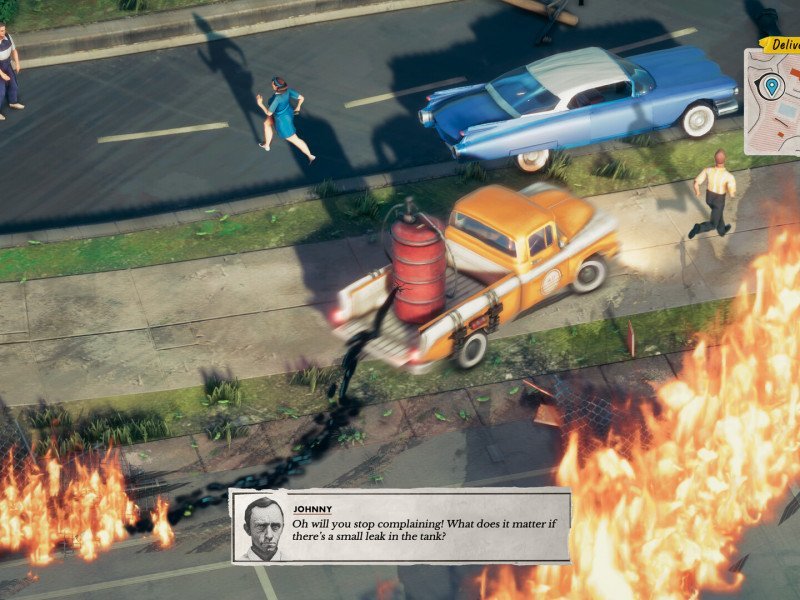 Nous sommes en 1959 : rock'n'roll, pois et une menace atomique menaçante se profile à l'horizon. Dans Deliver At All Costs, nous incarnons Winston Green, un livreur hors du commun à une époque où les villes américaines semblent sortir de leur glorieux passé. Crazy Taxi et l'esprit destructeur des premiers GTA nous sont immédiatement venus à l'esprit : le but ? Livrer des colis et semer le chaos, dans un mélange de physique déchaînée et de missions toujours hors piste. Dès le départ, le jeu se concentre sur le joueur qui aime tout détruire dans un monde semi-arriéré, entre camions de démolition, bombes ambulantes et statues improbables dans le porte-bagages. Cette orientation a été accueillie avec enthousiasme par les amateurs de chaos motorisé et d'action comique et imprudente. Au début, Winston est un ancien ingénieur en génie civil (AEC) qui traverse une période difficile et accepte un emploi chez We Deliver. Le scénario évoque des dettes, des visions troublantes (un renard roux apparaît en rêve) et un passé sombre : les ingrédients parfaits pour un mystère qui captive immédiatement l'attention. L'incipit est intriguant : Winston doit gérer des livraisons improbables, notamment des ballons explosifs et des statues insolites, tout en commençant à soupçonner quelqu'un de l'espionner. L'atmosphère paranoïaque fonctionne, accompagnée d'une tension narrative suspendue. Dommage que, au fil du récit, le récit perde de son élan : les rebondissements s'accumulent sans liens solides, et l'histoire elle-même finit par rappeler des clichés de science-fiction improbables et sans intérêt.