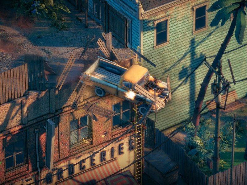 Le gameplay est au cœur de Deliver At All Costs : un mélange de conduite isométrique, de destruction artérielle et de missions en constante évolution. Winchester , au volant du camion We Deliver, se transforme en une force incontrôlable : destruction urbaine garantie avec tout ce qui bouge. Les livraisons sont caractérisées par une physique démesurée : chute de caisses de melons, ballons géants soulevant le camion, démolitions créatives. C’est cette variété qui offre les meilleurs moments, surtout au début. Le problème, c’est qu’avec le temps, la formule devient trop répétitive : détruire, livrer, recommencer. Malgré les missions « différentes », le manque de développement systémique (récompenses, évolutions, objectifs approfondis) fait de chaque chose une fin en soi. L'un des meilleurs moments est une course effrénée pour voler le colis d'un autre fourgon, avec des combats et des démolitions dignes de Crazy Taxi 2. Ces missions sont particulièrement réussies lorsque l'adrénaline, le temps et la compétition se combinent harmonieusement. Malheureusement, à côté de ces pics, on trouve des missions lentes ou ennuyeuses : équilibrer des ballons, tenir des melons ou effectuer des livraisons minimalistes au pas. Ces pauses atténuent la frénésie initiale d'un gameplay par étapes. La progression souffre du manque d'incitations : détruire des bâtiments ne rapporte pas de points, il n'y a ni classement ni récompense. Même les gadgets du fourgon, bien qu'amusants, ne sont jamais essentiels. L'ensemble donne l'impression d'une boucle sans véritable objectif. Techniquement, le camion est quasiment invincible : il se redresse tout seul, se répare avec un bouton et reprend vie après un retournement. C'est amusant, jusqu'à ce que cela devienne moins exigeant. Point positif : système de police et de poursuites : bruits de sirène, cachettes improvisées dans des poubelles ; Mais tout cela est mécanique et prévisible, sans jamais dépasser Ken et Barbie, avec des concessions de conception intéressantes mais peu mémorables.