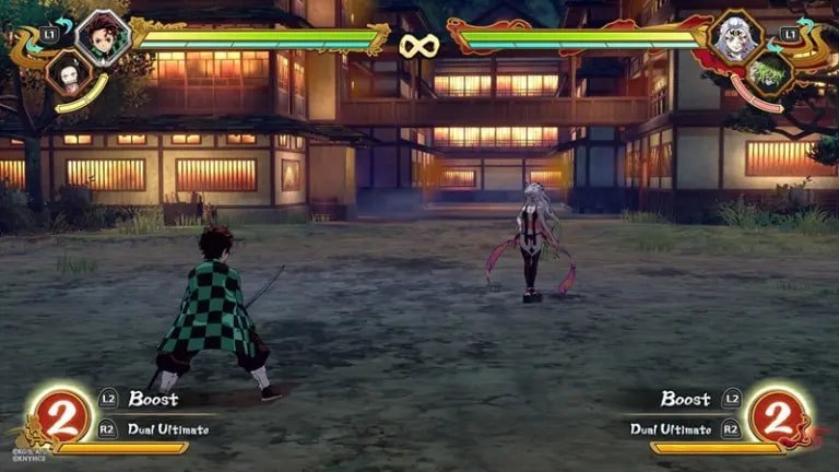 Comme dans le premier jeu, le mode Histoire est divisé en chapitres séquentiels, chacun proposant exploration et combat. Dans le premier jeu, nous avions déploré plusieurs problèmes, comme des animations lentes et des combats chronophages contre des démons de bas étage. Enfin, dans ce deuxième volet, CyberConnect2 a écouté les critiques des joueurs et a légèrement amélioré le gameplay de ce mode. Les déplacements des personnages en exploration sont beaucoup plus fluides et rapides, grâce à un bouton de course qui accélère les déplacements. De plus, il existe également une nouvelle fonctionnalité appelée Crowd Battle où lorsque Tanjiro rencontre un grand nombre de petits démons, la bataille passe en fait à Action Hack-and-Slash, ce n'est donc pas un combat en tête-à-tête comme combattre un personnage boss. Ce deuxième volet propose également des variantes de gameplay sous forme de mini-jeux, comme jouer du shamisen, un instrument traditionnel japonais en forme de guitare ou de banjo, mais à trois cordes pincées. Ces mini-jeux supplémentaires vous évitent de devoir constamment explorer ou combattre en mode Histoire. Les mini-jeux sont généralement divisés en trois niveaux de difficulté : Débutant, Intermédiaire et Avancé . Vous devrez appuyer sur les boutons qui apparaissent à l'écran, tels que le carré, le triangle, la croix et le O. Parfois, deux de ces boutons apparaîtront simultanément, nécessitant d'appuyer dessus simultanément. Si vous connaissez les jeux de rythme comme Hatsune Miku, Persona Dancing ou le mini-jeu de karaoké Like a Dragon , terminer ce mini-jeu est relativement facile. Cependant, pour obtenir la note S, vous devrez obtenir un score supérieur aux quatre lignes des paramètres ci-dessus. Ce jeu reprend le système de combat perfectionné du premier opus. Les combats se déroulent en deux contre deux : un personnage est activement engagé dans l'arène, tandis que l'autre joue le rôle d'assistant. Vous pouvez échanger les rôles avec le second personnage pendant le combat, mais les deux partagent la même barre de vie. Ainsi, si l'un des personnages tombe, la manche est terminée.