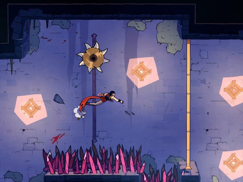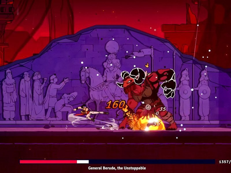The Rogue Prince of Persia est un roguelike basé sur la franchise du même nom, développé par Evil Empire et édité par Ubisoft. Dans ce jeu, notre prince préféré doit combattre l'armée des Huns qui tente de s'emparer de la Perse avec seulement son esprit, son habileté, sa sagesse et le petit avantage de remonter le temps s'il meurt grâce au collier qu'il porte. Rien de bien compliqué, n'est-ce pas ? Et pourtant, notre cher prince s'aventure dans un genre qui devient de plus en plus célèbre et courant dans cette nouvelle ère, le parkour. Il y avait de quoi être intrigué et inquiet, car le potentiel que cela représentait était presque égal au risque de finir en larmes. Avant de poursuivre, il faut rappeler que le jeu est resté pratiquement un an et demi en Accès Anticipé sur PC et qu'il a de facto beaucoup évolué. L'interface du roguelite est très lisible , surtout si vous êtes déjà familier avec le genre : la barre de vie se trouve en haut à gauche, juste en dessous de la barre d'action pour l'utilisation de l'arme à distance. En haut à droite, on trouve les orbes violets et la monnaie du jeu . Heureusement, ces deux derniers sont très petits à l'écran, ce qui est très pratique, compte tenu du gameplay frénétique de ce jeu . Ainsi, moins l'écran est encombré, mieux on comprend ce qui se passe. Le Prince possède deux types d' armes : de corps à corps et à distance . La première s'utilise en appuyant sur un bouton pour lancer des combos, tandis que l'arme à distance a un nombre d'utilisations limité. De plus, il est possible d'utiliser le coup de pied pour frapper les ennemis ou déplacer certains éléments sur la carte. Par exemple, il est possible d'utiliser le coup de pied pour déplacer un rocher et infliger des dégâts à un ennemi, ou pour étourdir les boss. Quant aux armes à distance, leurs utilisations se consomment et se rechargent simplement en frappant les ennemis. C'est donc une méthode très simple pour gagner.