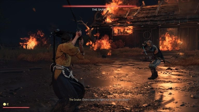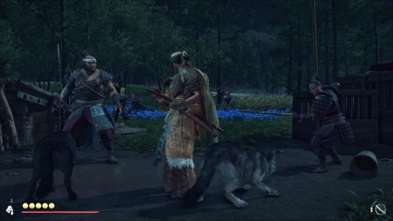 Atsu est équipée de deux barres situées en bas à gauche de l'écran : la barre de santé et la barre d'esprit . La barre de santé indique la santé du personnage ; si elle est complètement épuisée, elle chute. La barre d'esprit fonctionne comme les jeux de rôle, où elle est utilisée pour diverses techniques comme les soins, les attaques spéciales , etc. La barre d'esprit se remplit en éliminant des adversaires, en effectuant des parades, en utilisant des objets ou en dormant au camp. Les deux barres peuvent être augmentées en se baignant dans des sources chaudes ou en terminant des mini-jeux de coupe de bambou. Bien qu'elle ne soit ni un samouraï ni un ninja, Atsu dispose de deux options de combat : le combat frontal ou la furtivité. Les mécanismes de combat sont similaires à ceux de Tsushima, Atsu pouvant lancer des attaques légères et puissantes, esquiver, bloquer et parer . Plus récemment, Atsu sera souvent assistée par un loup qu'elle a déjà aidé. L'apparence du loup dépend de la proximité de son repaire. Au début, le loup apparaît aléatoirement, mais à mesure que vous améliorez les compétences d'Atsu et du loup, ils peuvent être invoqués sous certaines conditions, comme l'activation de Hurlement d'Onryo ou le lancer d'une arme. Les anciennes fonctionnalités comme « Stand Off » sont toujours disponibles. « Stand Off » vous permet de défier ouvertement vos ennemis en duel tout en préparant votre posture avant de les frapper d'un seul coup. Vous pouvez activer cette fonctionnalité en appuyant sur L1 lorsque vous entrez en territoire ennemi. Vous devez maintenir la touche triangle enfoncée en attendant le bon moment pour dégainer votre épée. Cependant, soyez prudent, car les ennemis peuvent également feinter ou simuler des mouvements pour vous attirer. Si vous vous trompez, votre barre de vie pourrait se vider et Atsu pourrait mourir. Il est intéressant de noter que la fonctionnalité Stand-off bénéficie désormais d'un nouvel ajout : s'il y a des loups qui errent près de vous ou lorsque vous portez un partenaire, ils participeront à cette session Stand-Off, afin que vous puissiez tuer plus d'ennemis dans un duel.