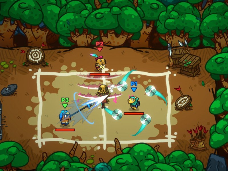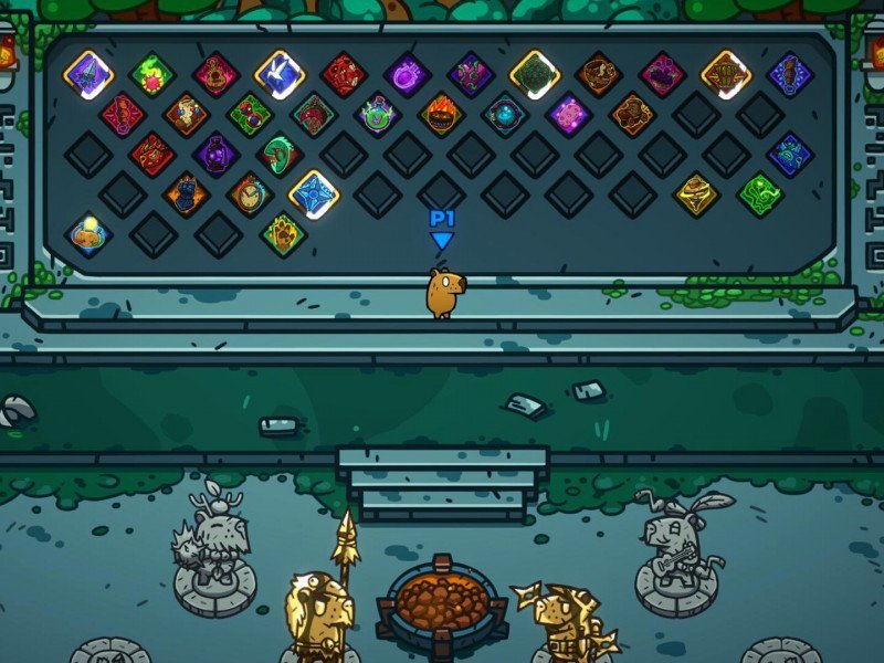 Bien que vous puissiez jouer à Extremely Powerful Capybaras seul, le jeu est conçu pour le jeu coopératif, et c'est là qu'il excelle. Les mécaniques de jeu restent les mêmes, que vous jouiez seul ou avec un ami (en ligne ou hors ligne), et l'objectif est le même : éliminer des hordes d'ennemis niveau après niveau, gagner de l'expérience et améliorer votre capybara, que vous choisirez parmi les classes disponibles. Vous vous déplacerez dans le jeu à l'aide d'un twin-stick shooter, et apprendre à utiliser votre classe (et, surtout, le build que vous assemblerez progressivement) est la clé pour maximiser votre plaisir. Le Barde est un capybara musical qui utilise la musique pour attaquer ; le Druide tire des projectiles floraux dans quatre directions diagonales ; l'Assassin possède des étoiles ninja appelées « tourne-vitesse » qui entourent son utilisateur et rayonnent vers lui ; et le Guerrier est équipé d'une lance. Chaque classe a des statistiques différentes, mais pour les consulter, vous devrez vous placer sur le piédestal de la classe souhaitée, puis mettre en pause et sélectionner les statistiques. À la manette, Extremely Powerful Capybaras est très facile à prendre en main, mais peut vite devenir lassant en raison de l'absence de narration pour motiver le joueur. Ce problème est atténué en coop, car l'objectif devient alors de semer le chaos, et à ce stade, tout est permis. La variété des classes et des améliorations est intéressante, même si elles ne suffisent pas à elles seules à soutenir l'ensemble du jeu.