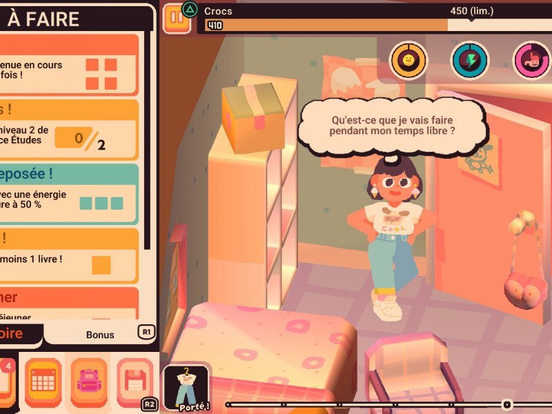 Consume Me se distingue par son mélange novateur de narration et de mini-jeux interconnectés, qui simulent la gestion quotidienne de Jenny de manière très concrète et captivante. Au cœur de l'expérience de jeu se trouve l'équilibre délicat entre l'alimentation, modélisée comme un puzzle de type Tetris où il faut assembler les aliments sans excès, et la gestion de l'énergie, de l'humeur et des relations de Jenny. Cette approche concrète de l'alimentation et de l'image corporelle rend le jeu à la fois éducatif et poignant, mais sa courbe de difficulté peut s'avérer ardue pour certains joueurs. La gestion du temps rend le jeu encore plus exigeant : chaque journée est divisée en plages horaires qu'il faut répartir judicieusement entre différentes activités comme les études, le sport, les tâches ménagères et les interactions sociales. Ce système de ressources limitées accentue la pression quotidienne que subit Jenny, la forçant à faire des choix stratégiques rapidement, au risque de perdre la partie. Bien qu'elle puisse revenir en arrière ou rejouer des chapitres avec des bonus, la tension reste palpable, car chaque décision a un impact direct sur l'état émotionnel et physique de l'héroïne. La variété des mini-jeux va des casse-têtes culinaires aux simples exercices de motricité, en passant par des tâches comme promener le chien, tous accompagnés de retours visuels et sonores pertinents qui encouragent le joueur à progresser. Malgré la répétitivité de certaines activités, la diversité des approches et le système de récompenses, avec ses tenues spéciales qui améliorent certaines activités, maintiennent l'intérêt du joueur tout au long de la partie. La courbe d'apprentissage est bien dosée, mais le jeu ne fait pas de compromis : il faut de la patience et de la persévérance pour maîtriser toutes ses mécaniques.