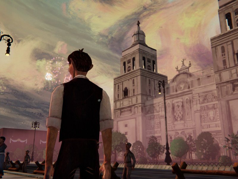 Ce qui retient vraiment l'attention, c'est la section artistique. C’est pour le moins exceptionnel. En n'ayant pas les graphismes d'un titre AAA, "Mexico, 1921: A Deep Slumber" se contente de son esthétique. Au-delà des personnages, qui se fondent bien avec le reste, les environnements ressemblent à des maquettes en carton. Pas mal, c'est comme voir un diorama de Mexico prendre vie. Le ciel ressemble aussi à un tableau dans le style de Vincent van Gogh. La bande originale gagne également un point, notamment le thème qui revient à plusieurs reprises et au début, dans El Unilatéral. C'est une pièce composée avec des sons de machine à écrire. On aime quand ils utilisent des éléments qui ont à voir avec le but de la composition. De même, certains angles de caméra dénotent une cinématographie notable. En revanche, l'absence de traduction française risque de laisser plus d'un joueur sur le bas côté, surtout que les dialogues sont assez nombreux.