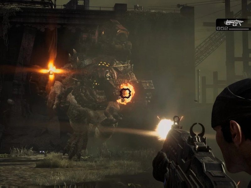 Le gameplay de Gears of War peut se résumer en trois phases : se mettre à couvert, tirer dans le tas et se déplacer, ce schéma étant à peu près répété durant tout un niveau. Trop simpliste ? Pas forcément. Déjà, le héros dispose de quatre armes à utiliser à bon escient : son pistolet standard ; un shotgun ; des grenades à envoyer, leur trajectoire et leur point de chute étant mise en évidence par une courbe à l'écran ; et enfin le fusil d'assaut faisant également office de tronçonneuse au corps-à-corps, avec le bel effet sanglant que cela occasionne venant même tacher la caméra au passage. Tout cela est violent, rythmé, et défoulant. En tout cas l'immersion est de mise, grâce aux somptueux graphismes et à l'ambiance sonore d'une part, mais aussi grâce à l'absence totale de HUD (sauf lors de la visée) et aux effets de caméra. Nous suivons les tribulations de Marcus grâce à une vue au dessus de l'épaule à la Resident Evil 4, mais cette caméra bouge et tremble comme si vous étiez suivi par un cameraman de CNN. C'est encore plus flagrant lorsque le personnage court, où l'on a vraiment l'impression de suivre un soldat à la télé durant une guérilla n'épargnant personne, même pas les caméras. Tout le monde sait que Gears of War a révolutionné le genre du jeu de tir à la troisième personne grâce à son système de couverture. À l'époque, c'était une approche inédite des combats : une approche dynamique et cinématique , qui permettait au joueur de contrôler l'espace et de vivre des combats avec un réalisme et une tension sans précédent.