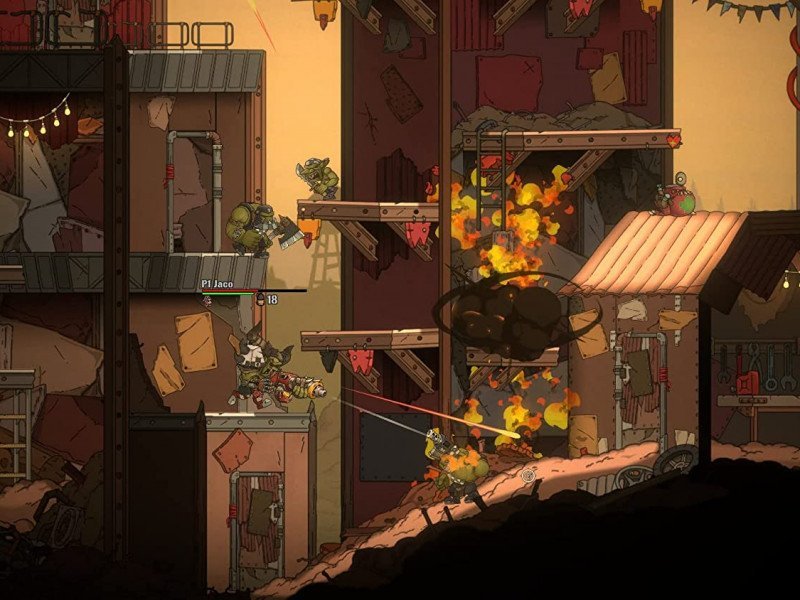 Le gameplay, quant à lui, est aussi simple qu'additif : on progresse dans les niveaux à défilement latéral en sautant de plateforme en plateforme tout en faisant exploser tout ce qui se trouve sur notre chemin. Au cours de nos aventures, nous accumulerons également des dents (beurk !), la monnaie en usage chez les Orks, que nous pourrons dépenser pour améliorer notre équipement (Dakka) ou acheter des ornements pour notre peau verte, comme des chapeaux et autres. Les commandes sont précises et les niveaux très bien pensés, bien qu'à certains endroits le jeu puisse être un peu pénible. Rien qu'un peu d'entraînement avec la manette ne puisse résoudre, également parce que les points de contrôle sont fréquents et bien placés. Chaque partie "occasionnelle" de Warhammer 40,000 : Shootas, Blood & Teef risque de se transformer en véritable marathon, tant le gameplay est amusant et addictif ! Ajoutez à cela (et ce n'est pas une mince affaire) une bande-son INCROYABLE, un métal Orcxesque à cornes qui ne déparerait même pas sur la bande-son de Metal : Hellsinger, des graphismes cartoonesques dessinés à la main, propres et fluides et, enfin et surtout, un souci du détail effrayant. Les personnages, les ennemis et le level design lui-même, en fait, reproduisent pratiquement tout ce qu'il y a à voir dans l'univers WH40K, avec des caractéristiques parfaitement équilibrées entre le caricatural et le précis.