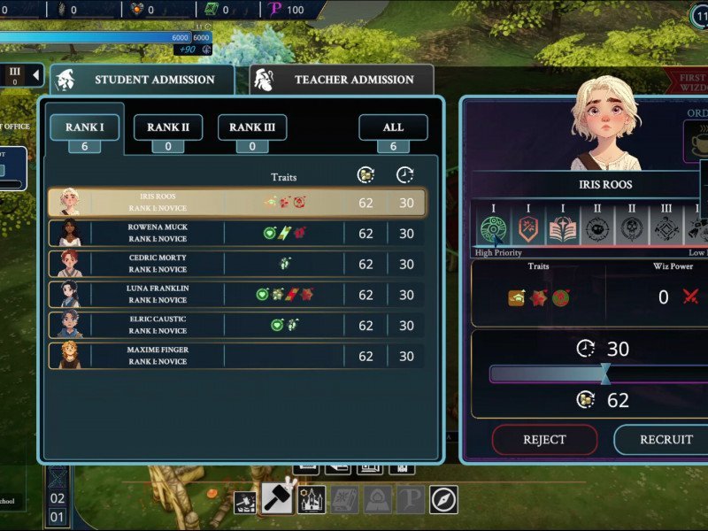 Mais construire ne suffit pas. Comme mentionné précédemment, il faut aussi attirer les étudiants, et cela ne peut se faire qu'avec des enseignants. Vos étudiants comme vos enseignants possèdent des qualités uniques qui non seulement déterminent leurs capacités, mais influencent aussi leur personnalité. Les élèves progressent au fil des cours. Plus ils suivent de cours, plus ils s'améliorent. Mais n'oubliez pas la qualité de vos professeurs. Les élèves qui se sentent négligés peuvent devenir difficiles. Le mana est important, mais il faut aussi garder le Conseil heureux. Si vous négligez trop souvent vos élèves, vous perdrez leur confiance. Les enseignants sont affectés à une classe. Leur efficacité dépend de la façon dont vous gérez les ressources dont vous disposez. Sachez que les élèves et les enseignants ont légèrement plus de défauts que de qualités, ce qui peut parfois compliquer les choses. Par conséquent, si vous n'intervenez pas, vous aurez affaire à de nombreux élèves rebelles. D'un autre côté, il y a les enseignants. Les très bons coûtent cher, tandis que les moins chers ne sont pas forcément idéaux pour un emploi. Vos salles de classe et vos chambres prennent vie, tout comme les espaces de pratique et autres espaces. Élèves et enseignants déambulent dans les couloirs animés et zoomer de temps en temps pour les observer en action est captivant. Graphiquement, le jeu vous invite à y jouer, ce qui le rend d'autant plus intéressant.
