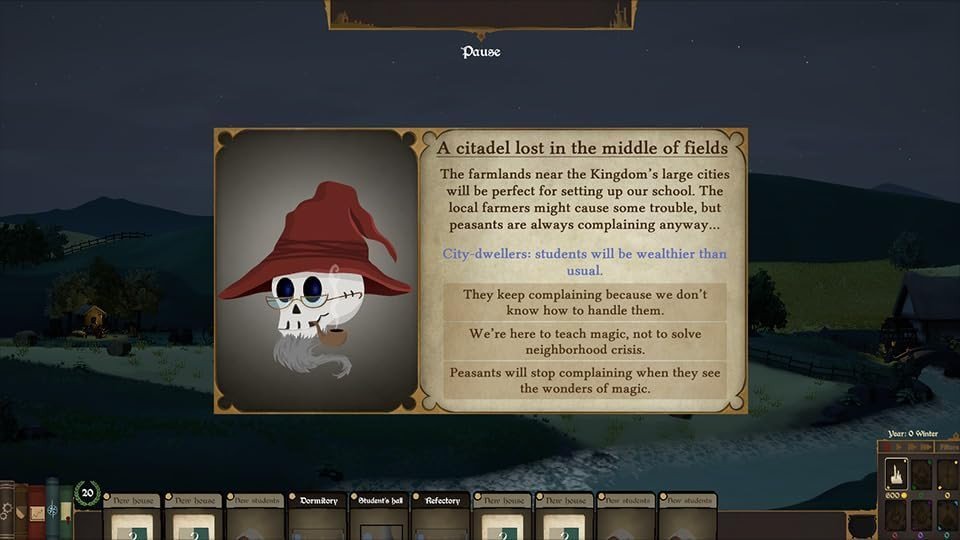 Spellcaster University est le premier effort majeur du studio indépendant Sneaky Yak Studio, né de la passion de trois frères pour les jeux vidéo. Après une longue phase de développement et une phase d'accès anticipé sur Steam durant laquelle les développeurs ont accueilli les suggestions des joueurs, Spellcaster University est enfin arrivé dans sa version finale sur PC il y a près de quatre ans et maintenant seulement les consoles sont servies. Dans un pays de magie, d'elfes et d'orcs, les forces du mal refont surface tous les 274 ans et demi pour semer le chaos parmi le peuple. À l'approche de l'hiver, le peuple se prépare à la guerre et à repousser le seigneur du mal dans les profondeurs de l'oubli. Mais à cause d'une erreur de calcul , le mal arrive cette fois-ci tôt, prenant les gens au dépourvu. Les premières victimes des hordes des ténèbres sont les écoles de magie obligées de renvoyer leurs élèves avant la fin de leurs études, parmi les rares survivants des écoles il y a nous sur qui pèse un lourd fardeau : reconstruire l'école de magie et partager les connaissances avec de nouveaux acolytes. Mais ce ne sera pas si facile car ce n'est qu'une question de temps avant que l'armée du Seigneur des Ténèbres ne nous atteigne, nous forçant à fuir et à recommencer notre travail ailleurs. Spellcaster University est un jeu de cartes de gestion dans lequel nous devrons construire une école de magie pour former ceux qui, dans le futur, pourront sauver le monde des ténèbres. La campagne est structurée en niveaux, chacun commençant par le choix de la zone dans laquelle construire notre université .