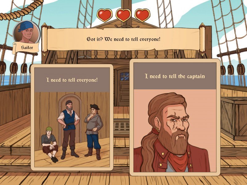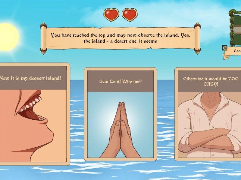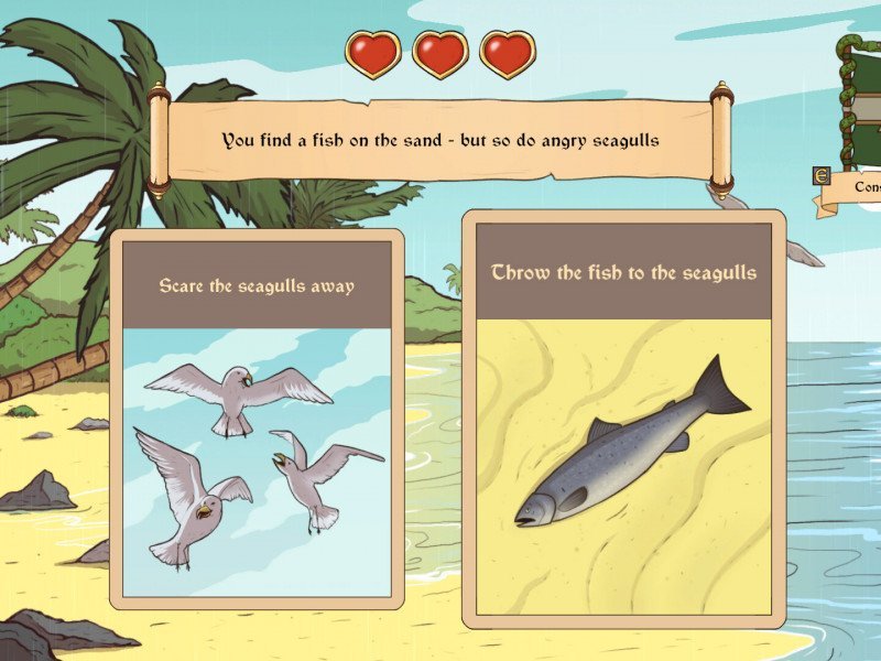 Si le premier volet de Choice of Life était une sorte de galop d'essai, le second une bonne histoire interactive, le troisième - Choice of Life: Wild Islands - renforce toutes les caractéristiques qui ont fait la popularité de la série. Son style visuel agréable nous plonge dans l'atmosphère de l'époque et du lieu de l'action. L'intrigue est véritablement non linéaire, où les choix du joueur comptent vraiment, et où quelques étapes apparemment anodines peuvent mener l'intrigue dans une direction totalement inattendue. C'est un humour sain et non vulgaire, tant oublié de nos jours, grâce auquel le jeu peut être joué avec des enfants. Et, cerise sur le gâteau, le jeu contient d'élégantes références à la culture populaire, à la musique et aux œuvres contemporaines. Hélas, tout ce beau discours rencontre un écueil de poids : Le jeu n'a toujours pas été traduit en français (il y a pourtant l'allemand et l'espagnol proposés) et ce semble manquement fera éloigner de nombreux joueurs de cette production indépendante. On ne s'étendra pas sur l'intrigue, qui est d'abord simple et claire. Vous incarnez un marin ordinaire, embarqué par hasard sur un navire voguant vers l'inconnu, à l'ère des découvertes géographiques et de la colonisation. Le personnage principal n'a pas vraiment d'histoire, ce qui vous permet de vous immerger pleinement dans l'instant présent, sans être distrait par un passé inconnu. Mais suite à un tourbillon d'événements, le navire n'atteint pas sa destination et nous nous retrouvons seuls sur une île tropicale pleine de secrets et de mystères. Malgré une certaine habitude et une aptitude à survivre, les aventures ne s'arrêtent pas là et le joueur se retrouve involontairement à la croisée de deux mondes, dans l'esprit de cette époque, où chaque camp a ses propres objectifs, valeurs et aspirations.
