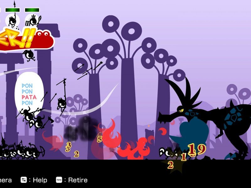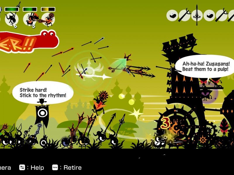 Vous disposez de quatre boutons d'action : carré pour la note « PATA » , rond pour la note « PON » , triangle pour la note « CHAKA » et croix pour la note « DON » . La combinaison de ces quatre boutons permet de générer diverses commandes pour contrôler les troupes Patapon. Au début, vous n'avez qu'une seule commande pour avancer. Cependant, au fil du jeu, de nouvelles commandes seront débloquées, comme attaquer, défendre, reculer, etc. Pour générer une commande à partir de quatre temps d'une note, vous ne pouvez pas appuyer sur n'importe quel bouton. Le timing est essentiel dans ce jeu. Vous devez saisir la commande à quatre temps pendant une pause entre les chants de la troupe Patapon. Si vous appuyez trop, pas assez ou si vous n'appuyez que sur un seul bouton, la commande est invalidée. Fait intéressant, lorsque vous synchronisez chaque commande avec succès, un compteur de combo apparaît à gauche de l'écran. Si le combo continue, vos troupes entreront en mode Fièvre , ce qui les rendra plus fortes et leur permettra de débloquer de nouvelles compétences. Avant de commencer une étape, il vous sera généralement demandé de rassembler vos troupes Patapon. Trois emplacements de troupes vous sont attribués parmi six types d'unités disponibles. Combiner les unités Patapon est crucial pour le bon déroulement de votre stratégie. Le placement des unités est également crucial, car un mauvais placement peut être fatal. Tout d'abord, il y a Yaripon qui est chargé de lancer des lances, puis il y a Tatepon qui tient des épées, des haches et des boucliers et devient l'avant-garde pour attaquer, puis il y a Yumipon qui est prêt à lancer des flèches depuis la rangée arrière, il y a Kibapon qui monte un cheval et est armé d'une hallebarde, puis il y a Dekapon qui est armé d'une masse et produit des dégâts importants jusqu'à Megapon qui joue un rôle de soutien depuis la rangée arrière en utilisant une trompette géante.