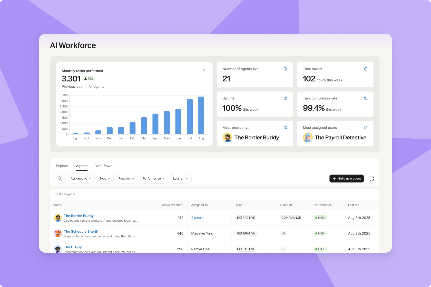 Au lancement, Deel AI Workforce proposera 7 agents IA spécialisés conçus pour répondre à des besoins précis en matière de RH et de paie :