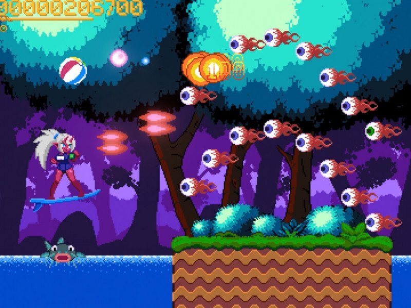 Développé par Super16bits, Twilight Parade: Moonlit Mononoke est un shoot'em up classique en 2D à défilement horizontal, conçu principalement pour les nouveaux joueurs. Comme son titre l'indique, Twilight Parade : Moonlit Mononoke n'a pas grand-chose à dire, bien au contraire. Et c'est vraiment dommage, car l'idée de base, bien que simple et banale, aurait pu être bien plus intéressante. En bref, les protagonistes, un groupe d'oni plantureuses et puissantes, n'ont pas été invitées à une sorte de méga-parade rassemblant une multitude de yokai. Plus précisément, il s'agit des célébrations du Hyakki Yagy? , ou « le défilé nocturne des cent yokai ». Il s'agit d'une tradition japonaise selon laquelle, chaque année, des centaines de y?kai envahissent les rues de la ville, exclusivement la nuit. Le folklore japonais a toujours exercé une fascination indéniable, et c'est l'une des raisons pour lesquelles nous nous attendions à davantage. Au lieu de cela, après une introduction écrite, nous sommes littéralement plongés dans l'action sans le moindre développement narratif. Il est également à noter qu'il n'y a même pas de conclusion… Après avoir terminé le cinquième et dernier niveau, le générique défile immédiatement, nous ramenant au menu d'ouverture, pour le moins décevant. Oui, Twilight Parade : Moonlit Mononoke ne compte que cinq niveaux , pour une durée de vie totale inférieure à une demi-heure. La raison ? Le jeu est d'une simplicité déconcertante : pas de véritable fin de partie et des « continuations » quasi infinies. À cela s'ajoutent quatre personnages seulement, chacun arborant une apparence légèrement suggestive, dont une oni plantureuse chevauchant une banane géante… Chaque oni est accompagné d'un petit familier servant de feu supplémentaire, mais, esthétiquement mis à part, ils se ressemblent tous, rendant les parties suivantes particulièrement superflues. Bref, Twilight Parade : Moonlit Mononoke est un shoot'em up 2D à défilement horizontal frénétique qui ne cherche pas à innover. C'est une expérience très rétro, presque arcade… à ceci près que le système de score est quasiment optionnel et constamment gâché par des continues infinis et des situations quasi impossibles.