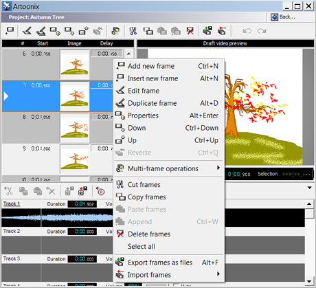 (0 Votes)Artoonix is software to create cartoons or animated movies on your PC. It is best suited for those who want to "liven up" static world of simple computer drawings, to try out your creative ideas on the animation canvas and show the results to family and friends. With Artoonix you can: - Create drawings and text effects in advanced Artoonix frame editor or simply add and modify objects from your existing pictures, photos (e.g. JPEG's, bmp, png, animated GIF's) and movies (e.g., avi, mpg, wmv, asf). - Animate and transform the drawings and photos using a host of traditional animation tools including Frame Tweening, Morphing, Warp and Distort . - Record multi-track sound from your microphone or insert soundtracks from wav or MP3 audio files. -Add sound effects to your animations (fade in and out, change levels and speed, mix varios tracks). -Export your animation to high-quality Flash SWF files or animated GIF's for easy web publishing, e-mailing, or to use as your mobile phone wallpaper. - Convert your animations into high-quality movie files (e.g. into an .avi file with your favourite compression codec - DiVX or Xvid) for professional output. Traditionally, animation process is associated with rather complex multiple stage process but it is intuitively simple in its basics. Artoonix makes it accessible to everybody, especially children. The user interface has been designed to guide the artist through the logical steps of animation process. Text menus, sidebars, mouse contextual menus and keyboard shortcuts reflect the need to concentrate on creative bits while having the right tools at hand.