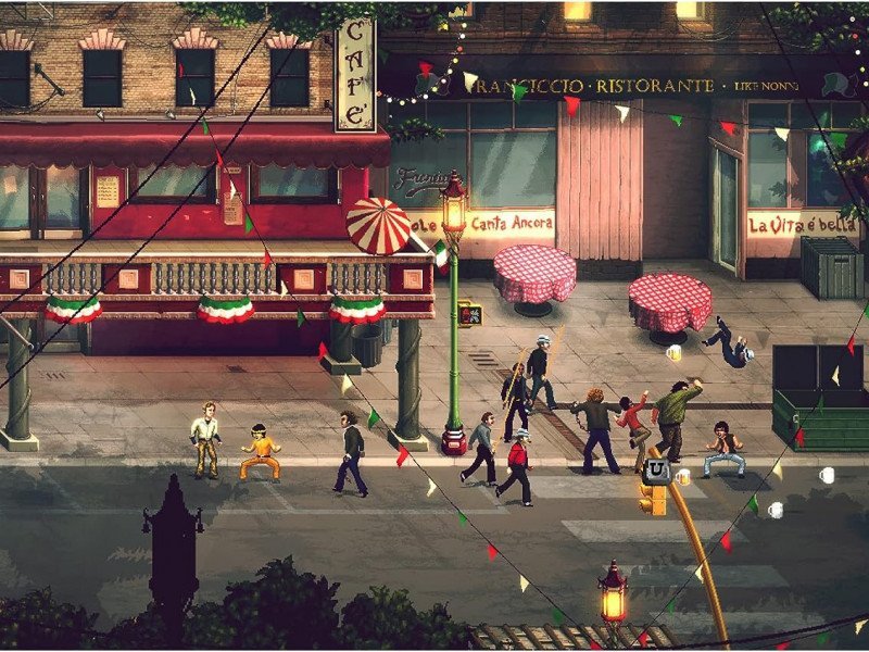 En plus des sections de combat, le jeu comprend des zones qui nécessitent une coopération entre les personnages. À certains moments, il est nécessaire de basculer entre les deux pour débloquer des chemins ou résoudre des énigmes et progresser dans le scénario. Ces séquences, ainsi que les cinématiques comiques doublées avec qualité (disponibles en anglais, en espagnol, en italien mais pas en français !), enrichissent l'expérience et rendent le gameplay plus amusant. Le jeu propose également des mini-jeux, tous contextualisés avec les étapes du jeu et faisant référence à des moments des films de Bud et Terence. Ces pauses entre les combats maintiennent le gameplay engageant, introduisant des activités nouvelles et amusantes. La présentation de Slaps and Beans 2 est remarquable. L'approche cinématographique, le scénario, la bande sonore avec des interprétations originales et des pistes des films, le pixel art exceptionnel et même les effets sonores qui recréent fidèlement les sons comiques des gifles et des coups de poing des films, tout est exécuté de main de maître. Cependant, ce qui devrait être l'élément le plus crucial de l'expérience, le gameplay, finit malheureusement par être la partie la moins satisfaisante. L'attention méticuleuse portée à tous les autres aspects a un peu nui à cette partie dans Slaps and Beans 2. Les commandes n'offrent pas la précision souhaitée, peut-être parce qu'elles ont essayé de capturer le chaos des scènes de combat des films dans le jeu.