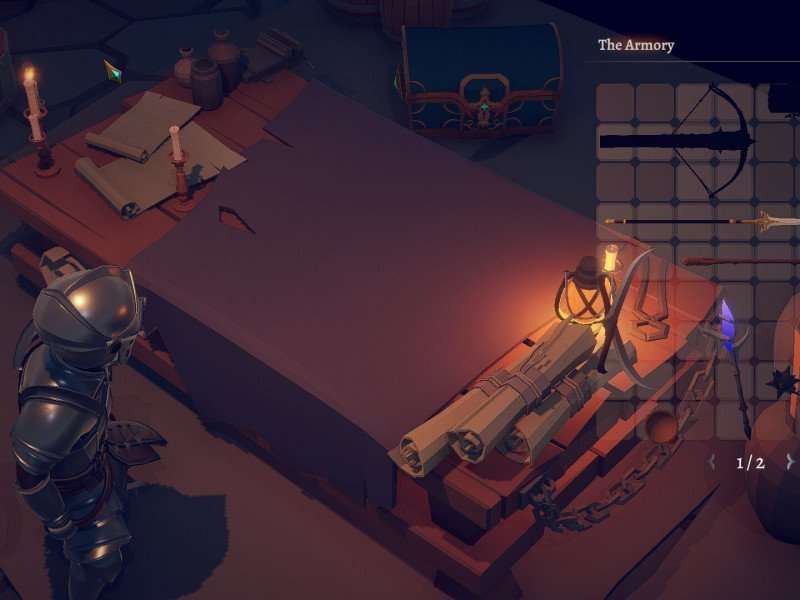 Le système de combat est donc extrêmement similaire à celui d'autres œuvres, comme Keeper's Toll, récemment testé, malgré quelques différences notables. Si le système de combat automatique reste le même – c'est-à-dire que les armes que l'on équipe progressivement agissent de manière autonome, frappant les ennemis en fonction de leurs priorités et de leur portée –, on retrouve également un nouveau système de gestion d'inventaire . Ou plutôt… inédit pour ce type de titre, puisque la structure du gameplay est empruntée textuellement à Resident Evil , et plus précisément au quatrième volet. Après chaque arène, nous aurons l'occasion essentielle de gérer notre inventaire, composé d'une série de cases. Ces cases peuvent augmenter en nombre à mesure que nous gagnons des niveaux en éliminant des ennemis. Plus de cases, plus d'espace pour stocker des objets. Quels objets ? Des armes, de l'équipement défensif et bien plus encore. Chaque objet a un coût, et les pièces , comme l'expérience, doivent être gagnées sur le champ de bataille. De plus, chaque objet occupe un espace spécifique, qui se traduit par un nombre de cases consécutives. Par exemple, une dague occupe trois cases en ligne droite, tandis qu'une petite faucille occupe trois cases plus une sur le côté pour sa pointe courbée. La gestion de l'espace est la base d'une configuration efficace qui nous permettra d'atteindre le boss final tant convoité.
