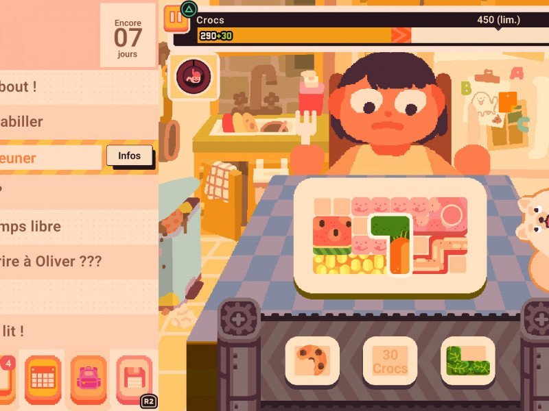 Consume Me se distingue par son mélange novateur de narration et de mini-jeux interconnectés, qui simulent la gestion quotidienne de Jenny de manière très concrète et captivante. Au cœur de l'expérience de jeu se trouve l'équilibre délicat entre l'alimentation, modélisée comme un puzzle de type Tetris où il faut assembler les aliments sans excès, et la gestion de l'énergie, de l'humeur et des relations de Jenny. Cette approche concrète de l'alimentation et de l'image corporelle rend le jeu à la fois éducatif et poignant, mais sa courbe de difficulté peut s'avérer ardue pour certains joueurs. La gestion du temps rend le jeu encore plus exigeant : chaque journée est divisée en plages horaires qu'il faut répartir judicieusement entre différentes activités comme les études, le sport, les tâches ménagères et les interactions sociales. Ce système de ressources limitées accentue la pression quotidienne que subit Jenny, la forçant à faire des choix stratégiques rapidement, au risque de perdre la partie. Bien qu'elle puisse revenir en arrière ou rejouer des chapitres avec des bonus, la tension reste palpable, car chaque décision a un impact direct sur l'état émotionnel et physique de l'héroïne. La variété des mini-jeux va des casse-têtes culinaires aux simples exercices de motricité, en passant par des tâches comme promener le chien, tous accompagnés de retours visuels et sonores pertinents qui encouragent le joueur à progresser. Malgré la répétitivité de certaines activités, la diversité des approches et le système de récompenses, avec ses tenues spéciales qui améliorent certaines activités, maintiennent l'intérêt du joueur tout au long de la partie. La courbe d'apprentissage est bien dosée, mais le jeu ne fait pas de compromis : il faut de la patience et de la persévérance pour maîtriser toutes ses mécaniques.