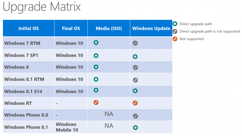 WindowsMicrosoft a indiqué comment les utilisateurs de Windows pourront mettre à jour leurs systèmes actuels. Les possesseurs de Windows 7 devront avoir le Service Pack 1 installé, tandis que ceux disposant de Windows 8.1 devront avoir l'ensemble des mises à jour mensuelles installées pour effectuer la migration depuis Windows Update. En cas de version antérieure des deux OS concernés, il restera la possibilité de passer par une image CD (.ISO).